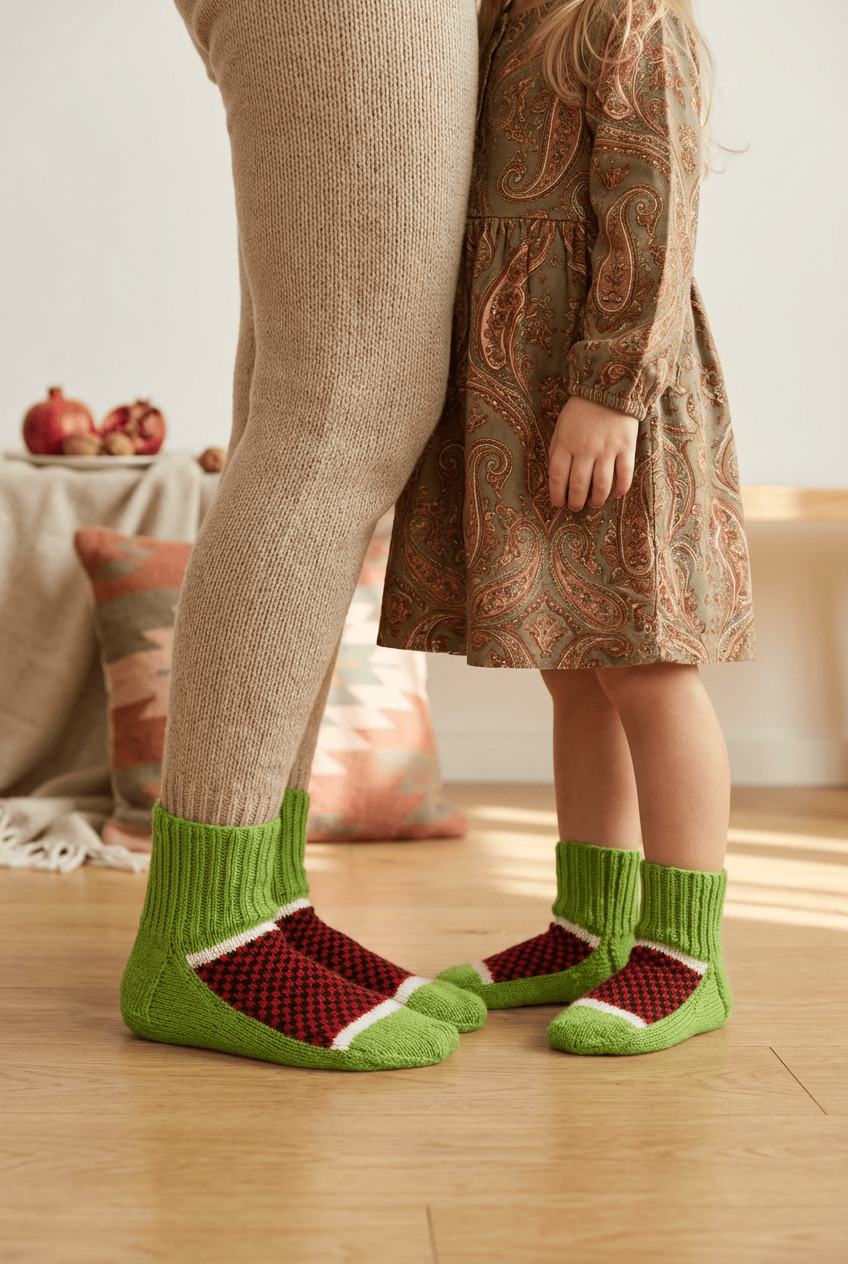 ترکیب رنگ سبز، قرمز و سفید بهصورت مشخص حالوهوای هندوانه شب یلدا را تداعی میکند و باعث میشود این مدل برای عکسهای خانوادگی، تمهای مناسبتی و هدیه دادن، انتخابی بسیار جذاب باشد. کشبافت دور مچ، انعطاف بالایی دارد و مدل را بهصورت فریسایز برای خانمها و کودکان مناسب میکند. بنابراین مادر و کودک میتوانند به راحتی یک ست یلدایی داشته باشند؛ ستهایی که هم در عکسها جذاب است و هم برای استفاده روزمره در روزهای سرد، کاملاً کاربردی.